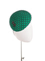 The Crystal Pillbox is a felt teardrop pillbox covered in a rhinestone net and finished with black crystal embellishments. Shown here in emerald.
