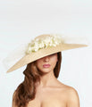 Beatrice is an elegant wide brim sinamay hat trimmed with a soft gypsophillia spray and delicate veiling.