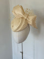 An elegant pillbox with sweeping lines and a statement bow, finished with matching veiling.