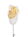 A pillbox with sweeping lines, trimmed with mixed blossoms and finished with millinery veiling. Shown here in yellow.