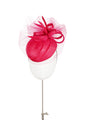 The Double loop percher is a parisisal pillbox with sweeping lines and a double self loop, all softened with millinery veiling. Shown here in navy, azalea & red.