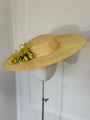 A striking sunny yellow boater made in a fine straw, trimmed with a mix of vintage mimosa flowers.
