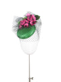 The Peony Veil Percher is a small circular parisisal pillbox trimmed with vibrant peony buds and a flurry of merry widow veiling.