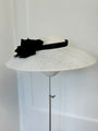 A monochrome down brim fine straw hat with silk abaca band and a handmade silk rose.