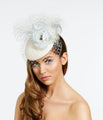Talya is a circular parisisal pillbox trimmed with a delicate vintage poppy, surrounded by soft curled feathers and crystal veiling.