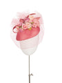 A mix of vintage silk roses and flowers on a fine straw pillbox finished with millinery veiling.